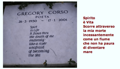 Gregory Corso ha chiesto di essere seppellito a Roma, in quel “Cimitero degli Inglesi” dov’è seppellito anche Shelley, il poeta che, durante il periodo del carcere minorile, aveva cominciato a leggere, il poeta che lo aveva spinto a scrivere poesie.