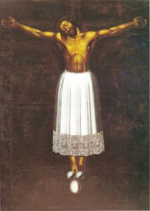 L’opera è di buona fattura accademica. Solo la fascia del merletto sui lati non fa corpo con la restante parte della stoffa, rimanendo scollata e a sé stante. L’impaginazione complessiva, nella resa del corpo su un fondo scuro, rientra dentro una tendenza che trae origine dal primo Seicento italiano. L’iconografia, a quanto mi risulta, non ha riscontri in Italia, mentre ha riscontri in diverse tele con analogo soggetto che si trovano in varie città della Spagna. Si tratta di una iconografia secentesca che fa riferimento ad una scultura lignea del secolo XIV, venerata nella chiesa madre di S. Maria di Burgos. Proprio in rapporto con la venerazione del Cristo di Burgos verranno ad essere realizzati diversi dipinti. Il corpo del Cristo ligneo di Burgos è rivestito di pelle umana e indossa dai fianchi in giù una veste sacerdotale riccamente lavorata. I piedi, saldati alla croce con due chiodi, uno per ogni piede, sono contornati da una corona; nella parte terminale della croce in basso si ttovano tre uova di struzzo.